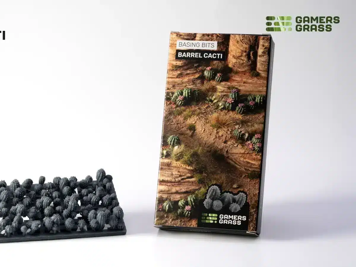 Cette boîte contient une grappe de Barrel Cacti Basing Bits imprimés en 3D.